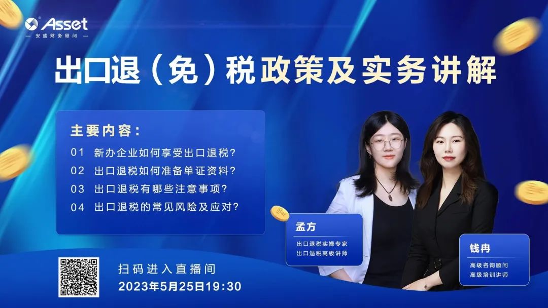 5月25日19:30,安盛財務組織開展“安盛財稅云課堂”——《出口退(免)稅政策及實務講解》直播課,本次直播邀請咨詢顧問中心錢冉老師和項目服務中心孟方老師帶來專業(yè)講解。